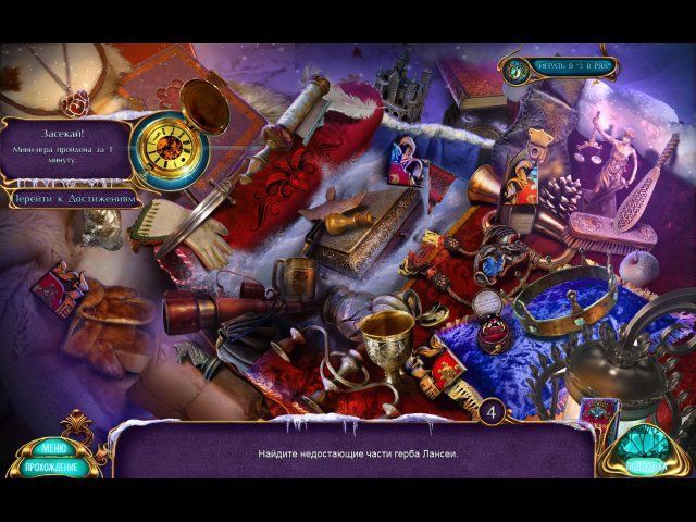 Все успехи будут отмечены наградами. Например, "Уильям Добрый" — вы покормили кролика, "Магия меня оберегает!" — победили волка, "Искусный алхимик" — расколдовали обсидиановых воинов, "Близкое наблюдение" — без подсказки прошли СПП, "Следуй за тенями" — завершили 3 СПП, и каждую — за 2 минуты или меньше, "Коллекционер" — отыскали 100 предметов, "В яблочко!" — обошлись без случайных кликов на СПП, "Альтернативная история" — прошли игру "Три в ряд", "Засекай!" — закончили мини-игру за минуту, "Мастер логики" — не пропустили 10 мини-игр. Удачи!