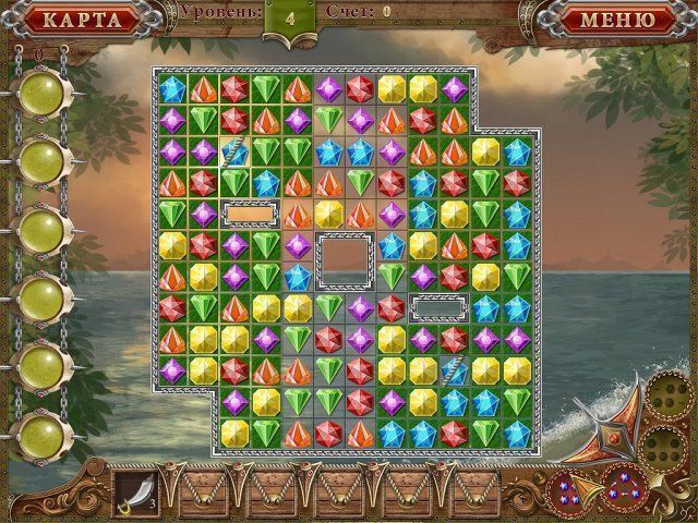 Кроме того, часть ячеек заблокирована веревками. Чтобы избавиться от них, необходимо объединить их с такими же фишками. Периодически на поле будут появляться сверкающие драгоценные камни. Включая их в ряды, группы или цепочки, вы получаете шанс заработать полезные бонусы, которые позволят вам быстрее справиться с заданием и перейти на следующий уровень. Например, нож поможет выбить одну любую фишку, взрывчатка — любую фишку вместе с соседней с ней, а арбалет уничтожит целый ряд фишек.