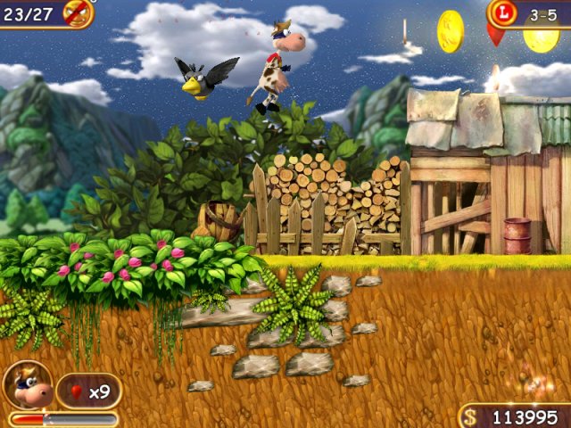 Одолеть любых противников Супер Корове поможет ее природная прыгучесть. Если она налетит на врага сверху, да еще и наподдаст ему копытом, то соперник вылетит с уровня быстрее пробки!