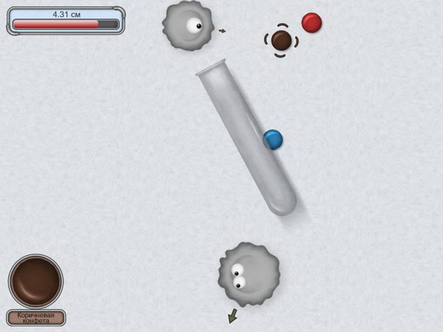 Началось все с того, что добрый ассистент профессора скормил ему пару конфет. Глазастик проглотил угощение, понял, в чем смысл его жизни, выбрался из аквариума и отправился добывать еду. Что съедобного можно найти в лаборатории? Много всего! Главное, чтобы пища по размеру была меньше Глазастика. Для начала нужно съесть все разноцветные пилюльки, флэшки, пробирки и всякую местную живность. Глазастик — существо непривередливое, гурманом его не назовешь!