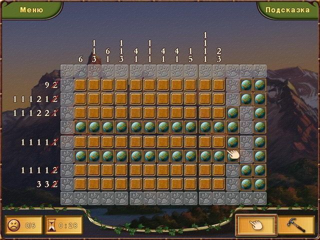 Обращайте внимание на цифры. Они указывают, сколько глобусов спрятано за ячейками в рядах и столбцах игрового поля. Чтобы решить логическую задачку, вам нужно найти все глобусы. Если перед вами столбец из пяти клеток, над которым стоит цифра "2" — значит, в столбце два глобуса. Глобусы обязательно идут подряд друг за другом, между ними нет промежутка. Но находиться они могут где угодно в этом ряду. Начинать разгадку всегда нужно с тех рядов или столбцов, где спрятано максимальное количество глобусов. Не забывайте, что если вы видите цифру "0", то в этом столбце или ряду нет ни одного глобуса — можно смело разбивать молотком пустые клетки.